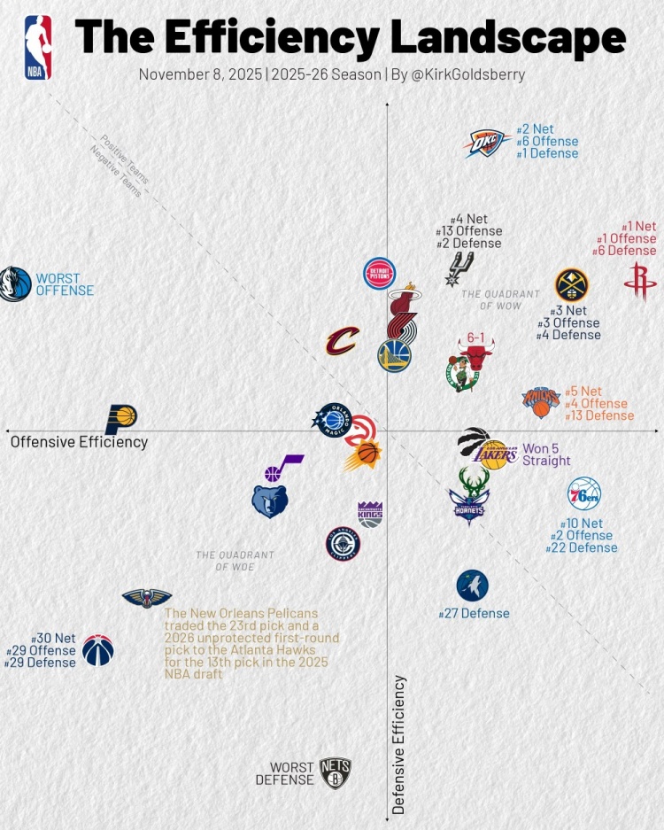 2025-11-08 00:09:22本赛季效率值图表:火箭&雷霆净效率前二 独行侠进攻垫底